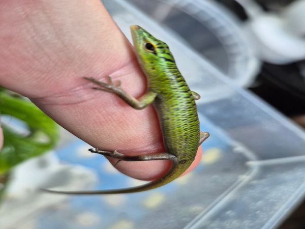Emerald tree skink (Lamprolepis smaragdina). 3-5 month old baby skinks. Doing all they should, great appetite. Perfect age to start conditioning to become great tame little lizards.
